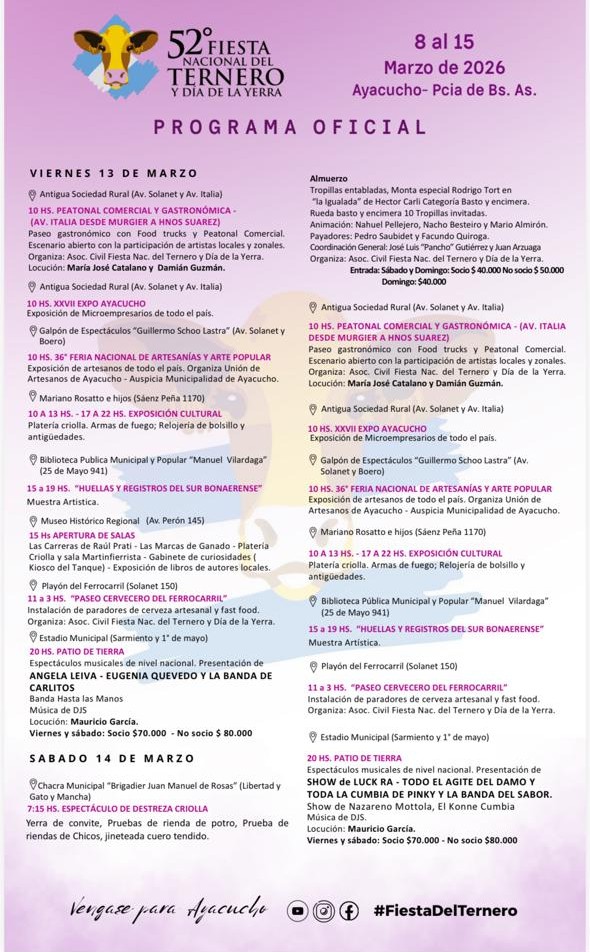Todo el programa oficial de la 52ª Fiesta Nacional del Ternero y Día de la Yerra 15 marzo, 2026 Redacción 47ª Fiesta del Ternero, destacados, Fiesta del ternero 0 Ya comenzaron las actividades de nuestra Fiesta Nacional del Ternero y Día de la Yerra. La misma se desarrollará en base al siguiente programa oficial que nos fue entregado desde el área de Prensa de la entidad. X