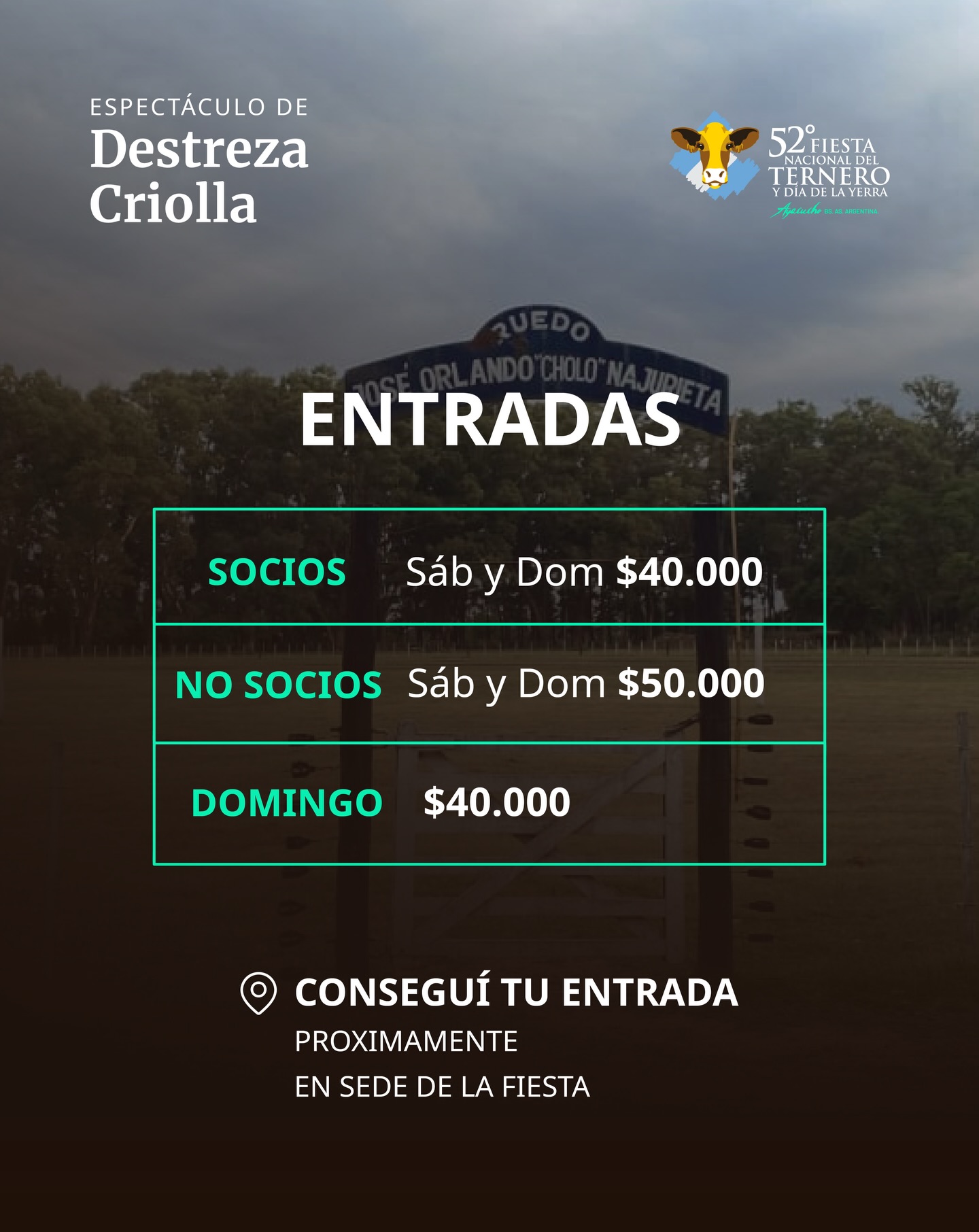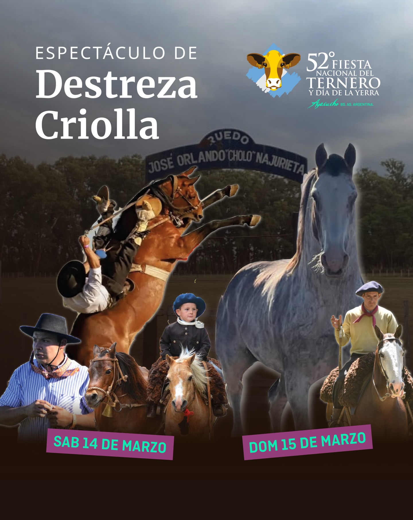 Desde la Fiesta del Ternero dieron detalles sobre lo que será el espectáculo de Destreza Criolla de la Chacra Municipal, a desarrollarse este sábado 14 y domingo 15 de Marzo. La actividad se iniciará con la Yerra de Convite a las 7.15 horas.