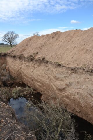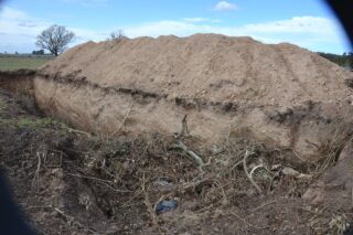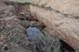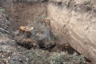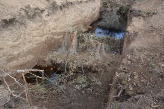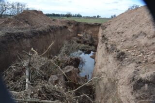 En el interior de la misma, que repetimos tiene unos 4 metros de profundidad y que con los montículos sobre uno de los laterales, la diferencia de altura se multiplica, se encuentran raíces que han arrojado de árboles recientemente retirados como también, dada las últimas lluvias, también se ha acumulado agua por lo que el peligro es aún mayor.