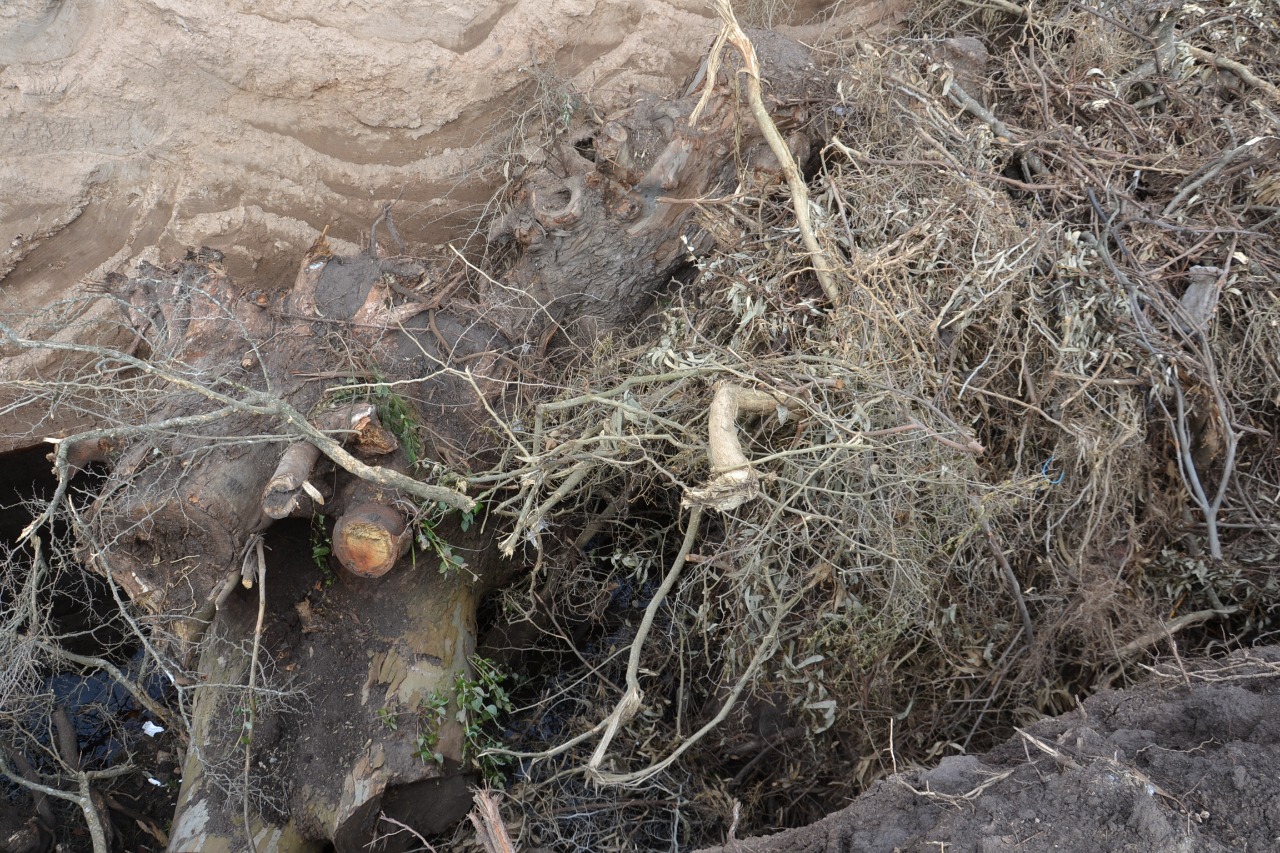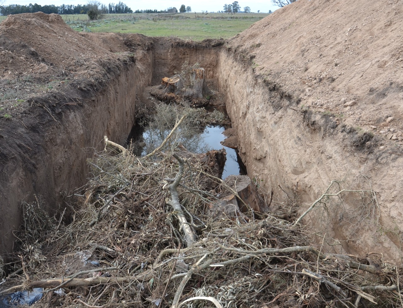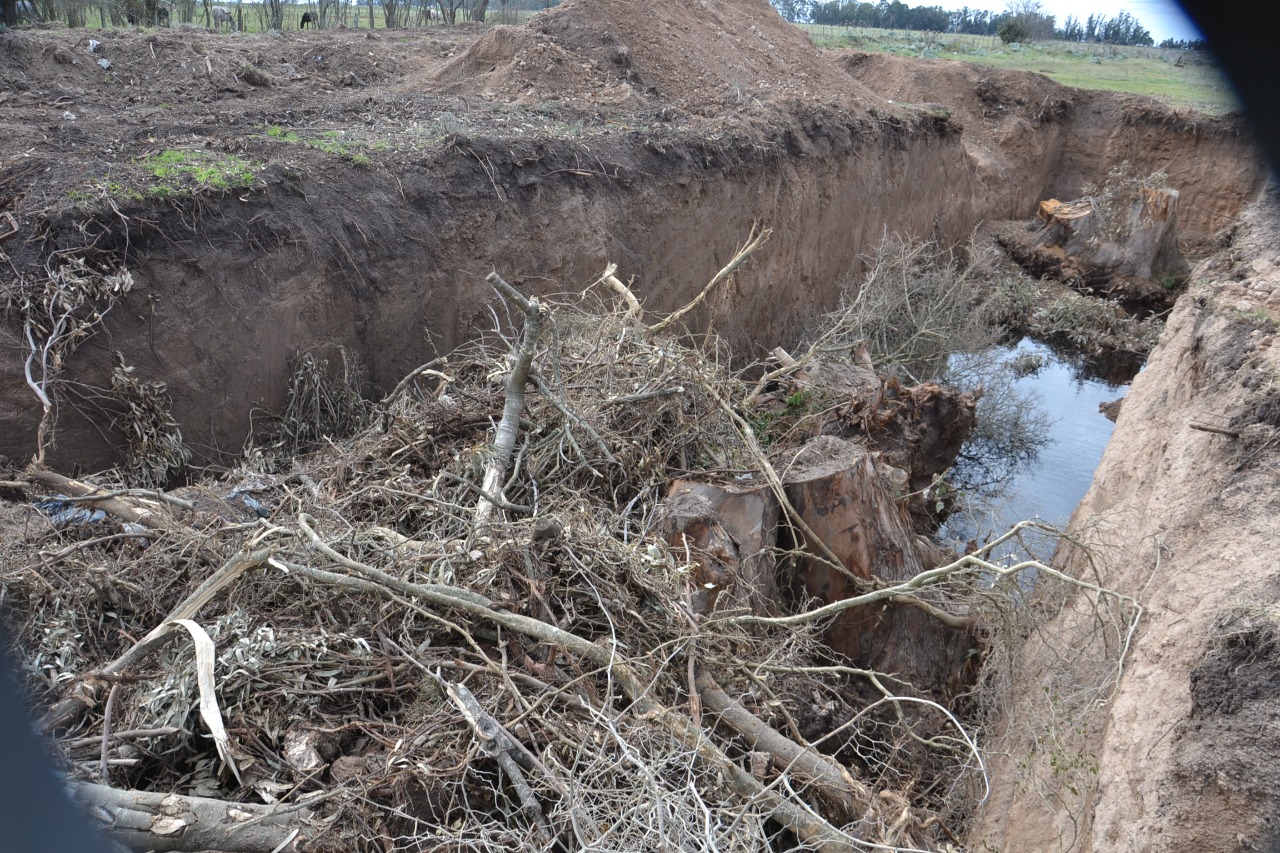 En el interior de la misma, que repetimos tiene unos 4 metros de profundidad y que con los montículos sobre uno de los laterales, la diferencia de altura se multiplica, se encuentran raíces que han arrojado de árboles recientemente retirados como también, dada las últimas lluvias, también se ha acumulado agua por lo que el peligro es aún mayor.