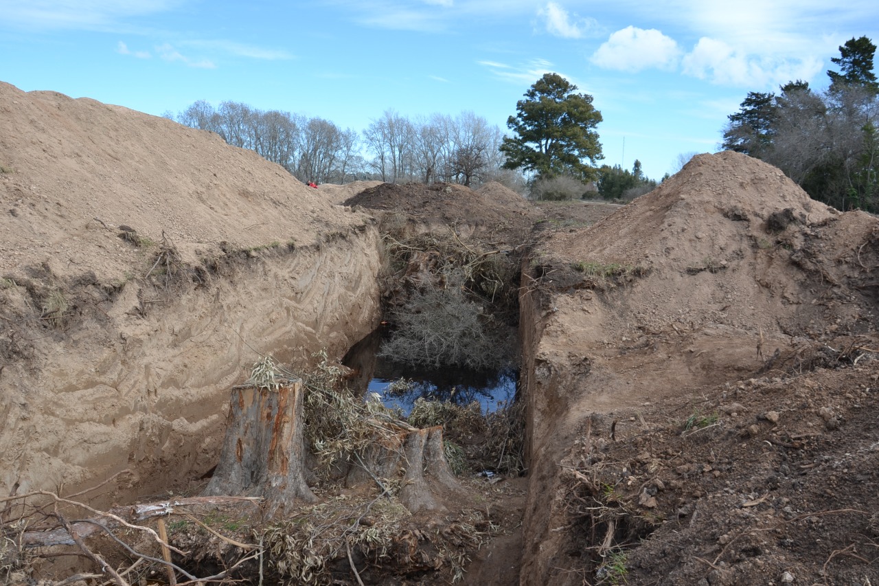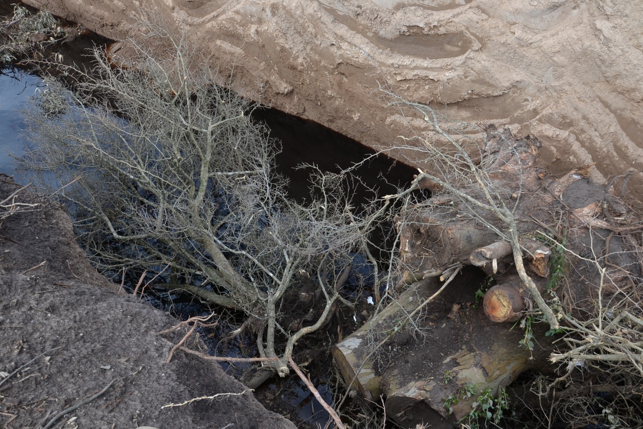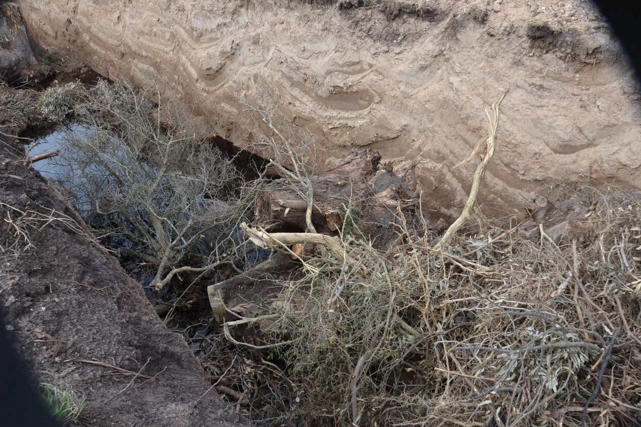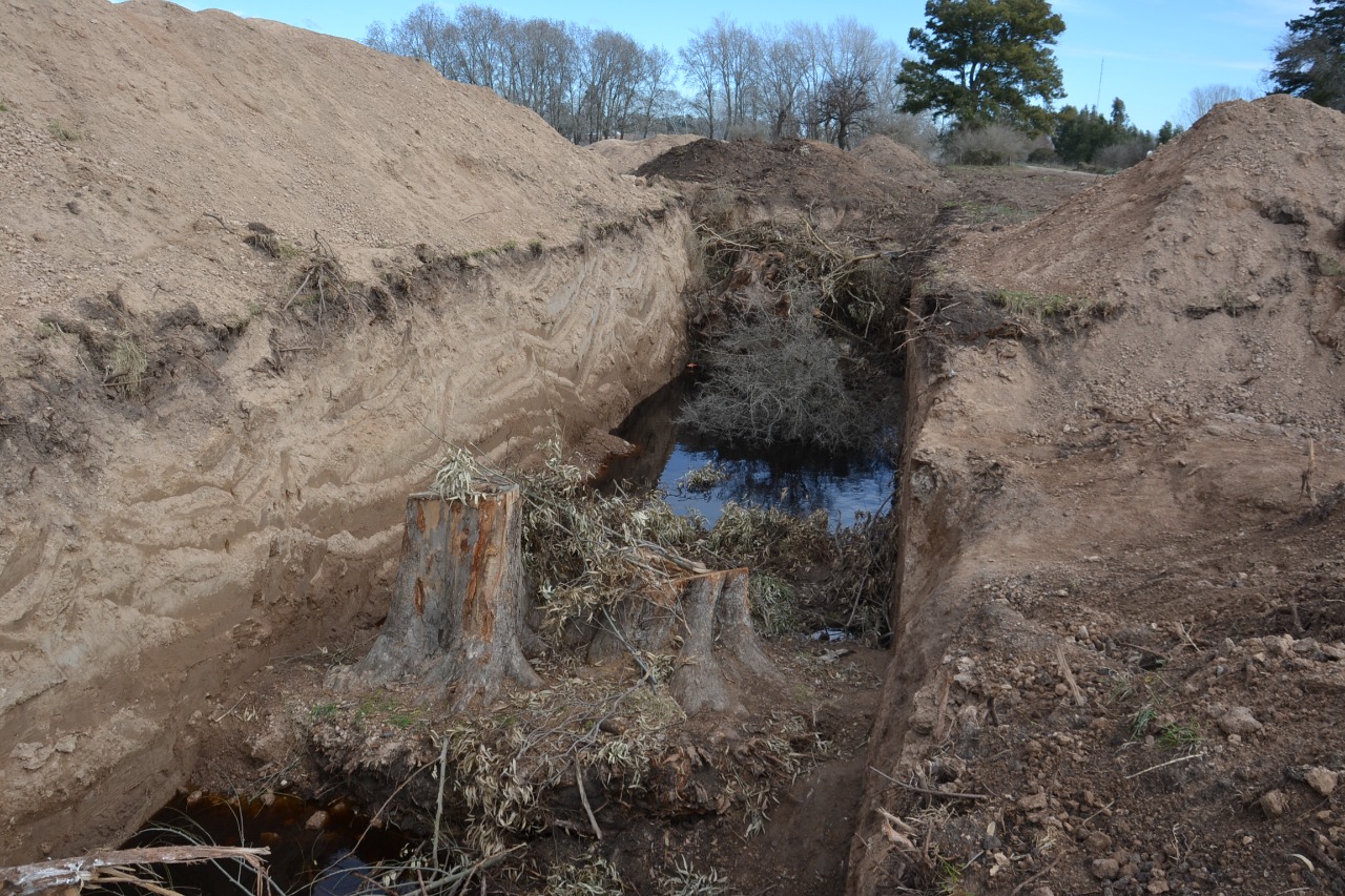En el interior de la misma, que repetimos tiene unos 4 metros de profundidad y que con los montículos sobre uno de los laterales, la diferencia de altura se multiplica, se encuentran raíces que han arrojado de árboles recientemente retirados como también, dada las últimas lluvias, también se ha acumulado agua por lo que el peligro es aún mayor.