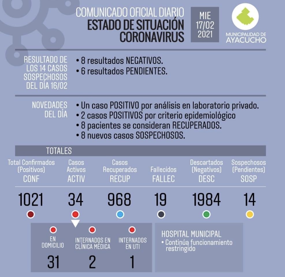 Tres nuevos casos positivos de COVID se registraron en nuestra ciudad y que fueron detallados en el informe de prensa. De los 14 pendientes, 8 fueron negativos y 6 quedaron por conocer su resultado. Los positivos que se dieron fueron dos por criterio epidemiológico y uno en un laboratorio privado.