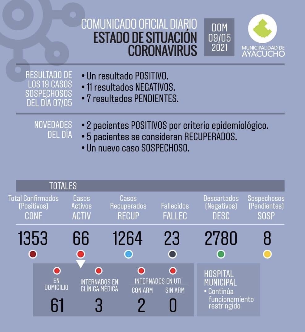 Este domingo 9 de Mayo se registraron 3 positivos de Covid y como también se dieron 5 pacientes recuperados, los activos son 66. De ese total, 5 se encuentran hospitalizados (dos en UTI y los restantes en clínica médica).