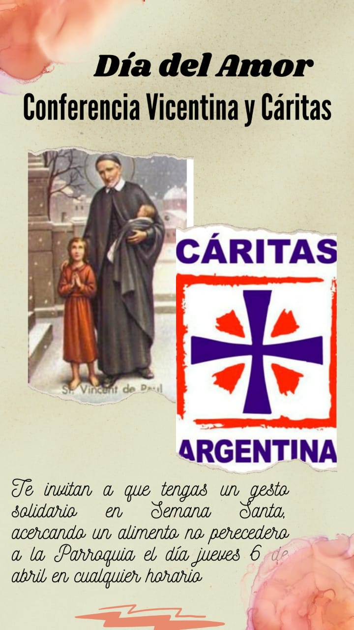Desde Cáritas y Conferencia Vicentina, invitan a toda la comunidad a tener un gesto solidario, un “Día de amor”, en esta Semana Santa que se inicia. Lo hacen proponiendo que acerques un alimento no perecedero a la Parroquia el venidero jueves 6 de Abril, en cualquier horario.