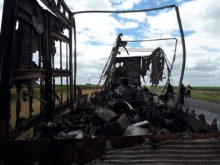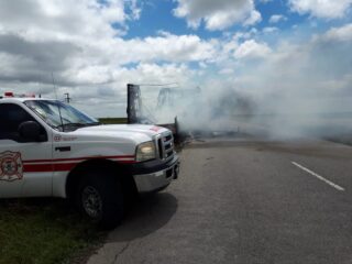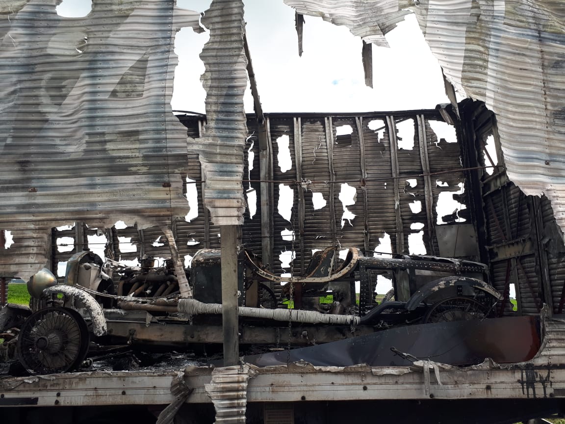 Arribados al mismo se constató que se trataba del incendio declarado de un semirremolque y toda su carga, entre lo que resaltaban un automóvil, dos cuatriciclos y una moto de agua; los cuales se vieron afectados en su totalidad.