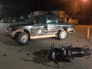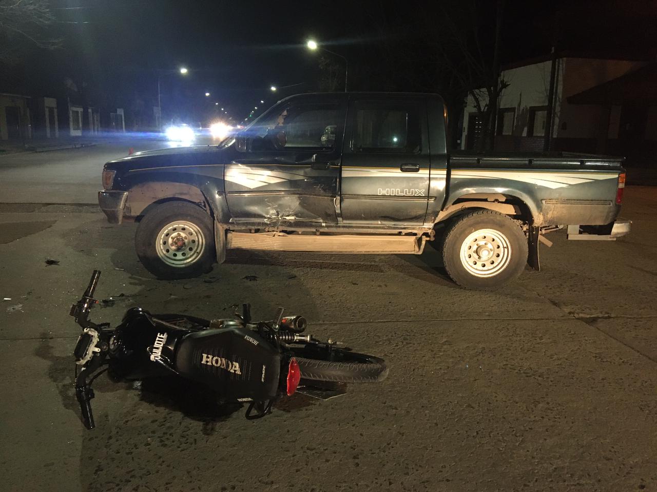 Un joven que conducía una motocicleta Honda de 150 cc debió ser trasladado al Hospital Municipal dado los golpes sufridos al colisionar contra una camioneta Toyota Hilux, este viernes a la tardecita, alrededor de las 19,30 horas, en la esquina de Avenida Colón y España.