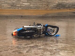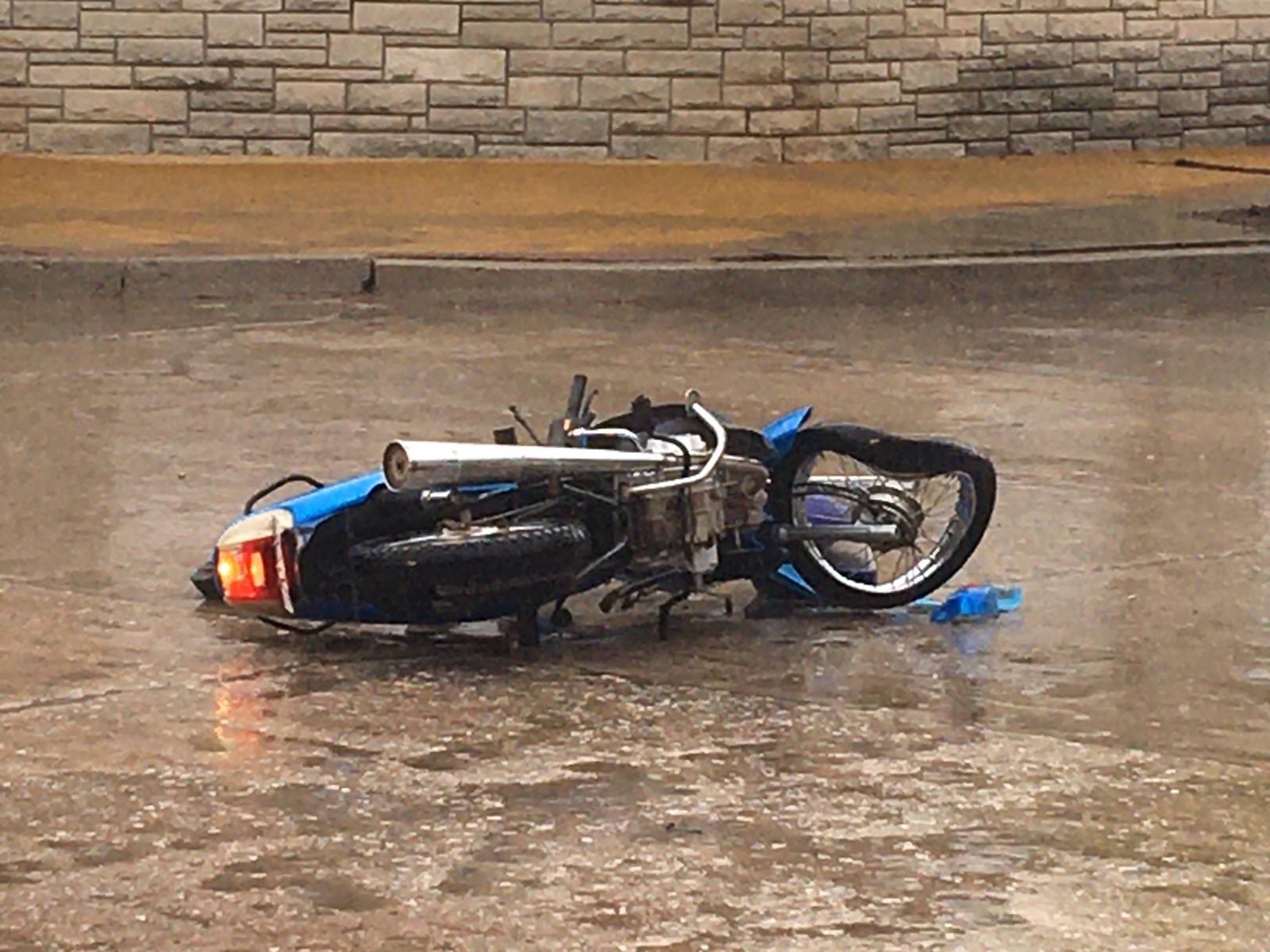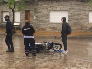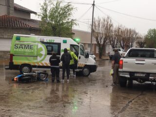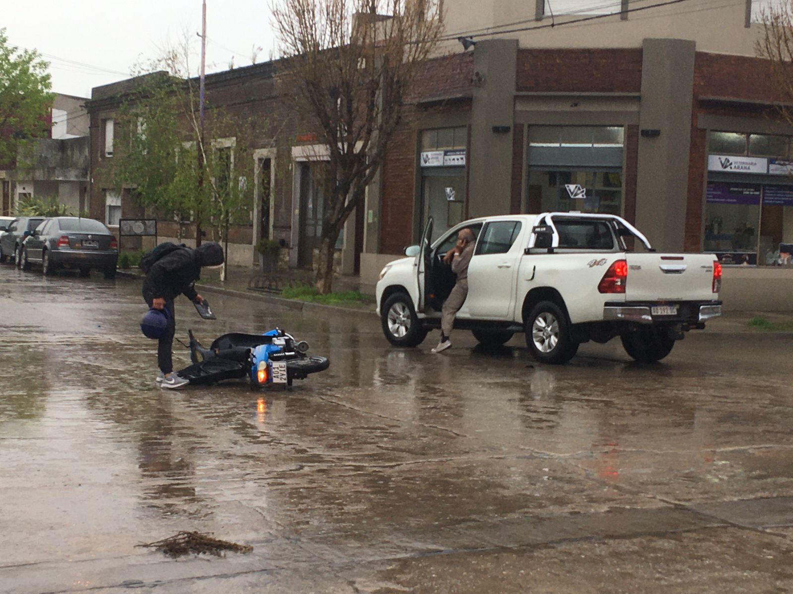 Un joven motociclista debió atendido por una unidad del SAME tras haber protagonizado un accidente con la moto que conducía y una camioneta Toyota Hilux, este jueves por la tarde alrededor de las 18 horas, en la esquina de San Martín y Arroyo. A la hora del siniestro, llovía copiosamente en nuestra ciudad.