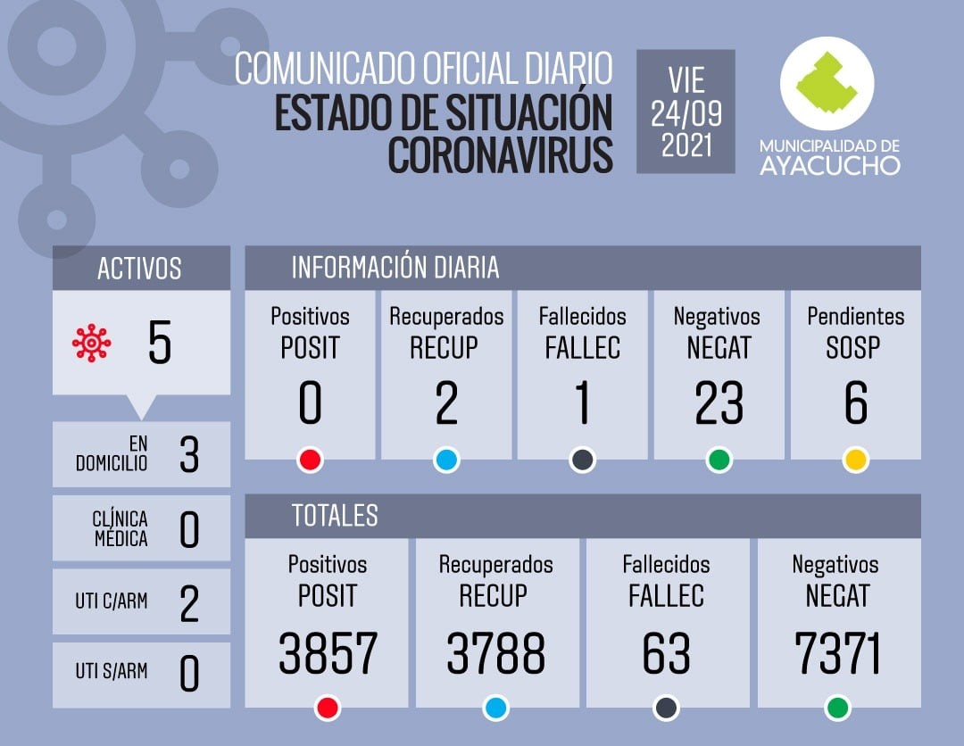 Un nuevo fallecimiento por Covid se registró en Ayacucho. Se trata de una mujer de 89 años que estaba internada en el Hospital Municipal en Clínica Médica desde hace varios días. Con su deceso, son 63 las víctimas desde el inicio de la pandemia.