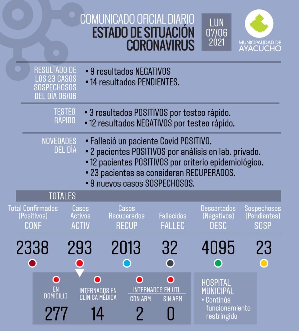 Con respecto a lo que sí señala el parte de prensa, se registraron 17 positivos de Covid y 23 recuperados, en lo que representa una nueva baja en los casos activos que en estos momentos son 293.