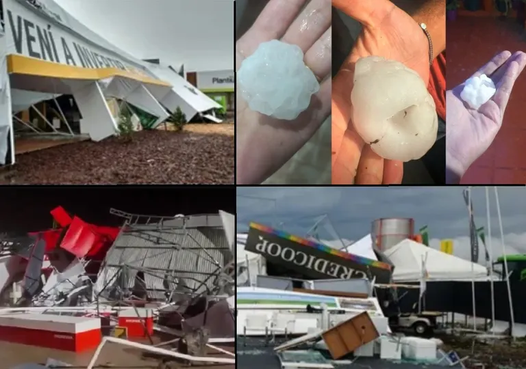 Sin embargo horas después y cuando ya era noche en San Nicolás, una violentísima tormenta de lluvia y vientos destrozó stands, y afectó incluso a máquinas agrícolas.