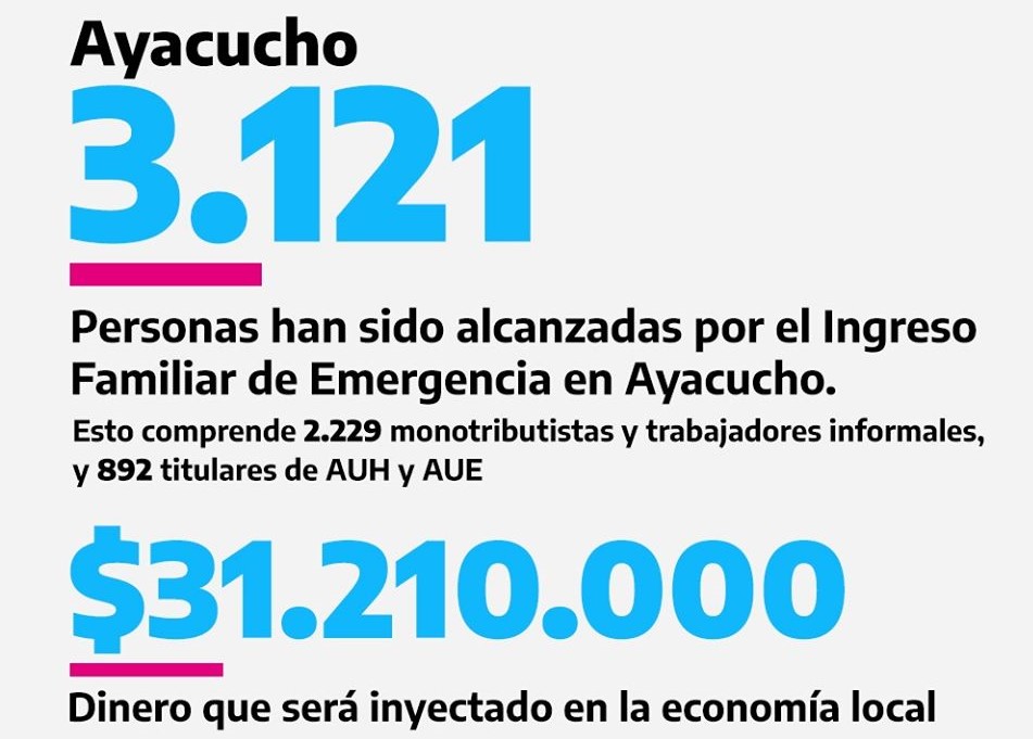 Un total de 3.121 beneficiarios de la IFE fueron confirmados en Ayacucho, lo que representa 31 millones de pesos para la economía de Ayacucho. Son algo más de 31 millones de pesos que Nación empezó a inyectar a la economía de toda la ciudad a través del Ingreso Familiar de Emergencia que entrega el ANSES.