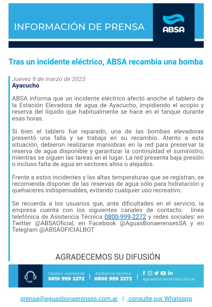 ABSA no informó cuánto demorará en las acciones. “Si bien el tablero fue reparado, una de las bombas elevadoras presentó una falla y se trabaja en su recambio. Atento a esta situación, debieron realizarse maniobras en la red para preservar la reserva de agua disponible y garantizar la continuidad del suministro, mientras se siguen las tareas en el lugar. La red presenta baja presión o incluso falta de agua en sectores altos o alejados”.
