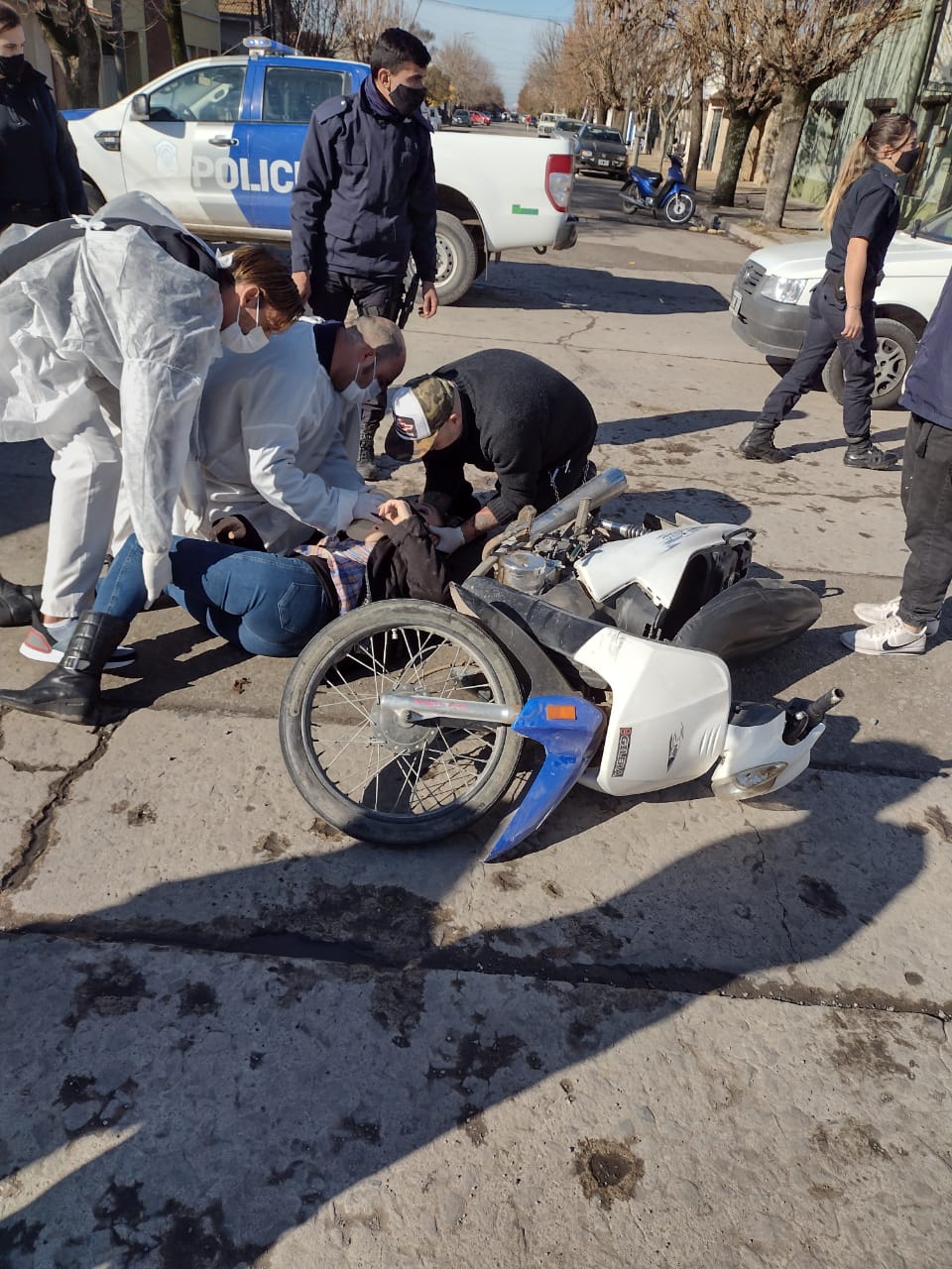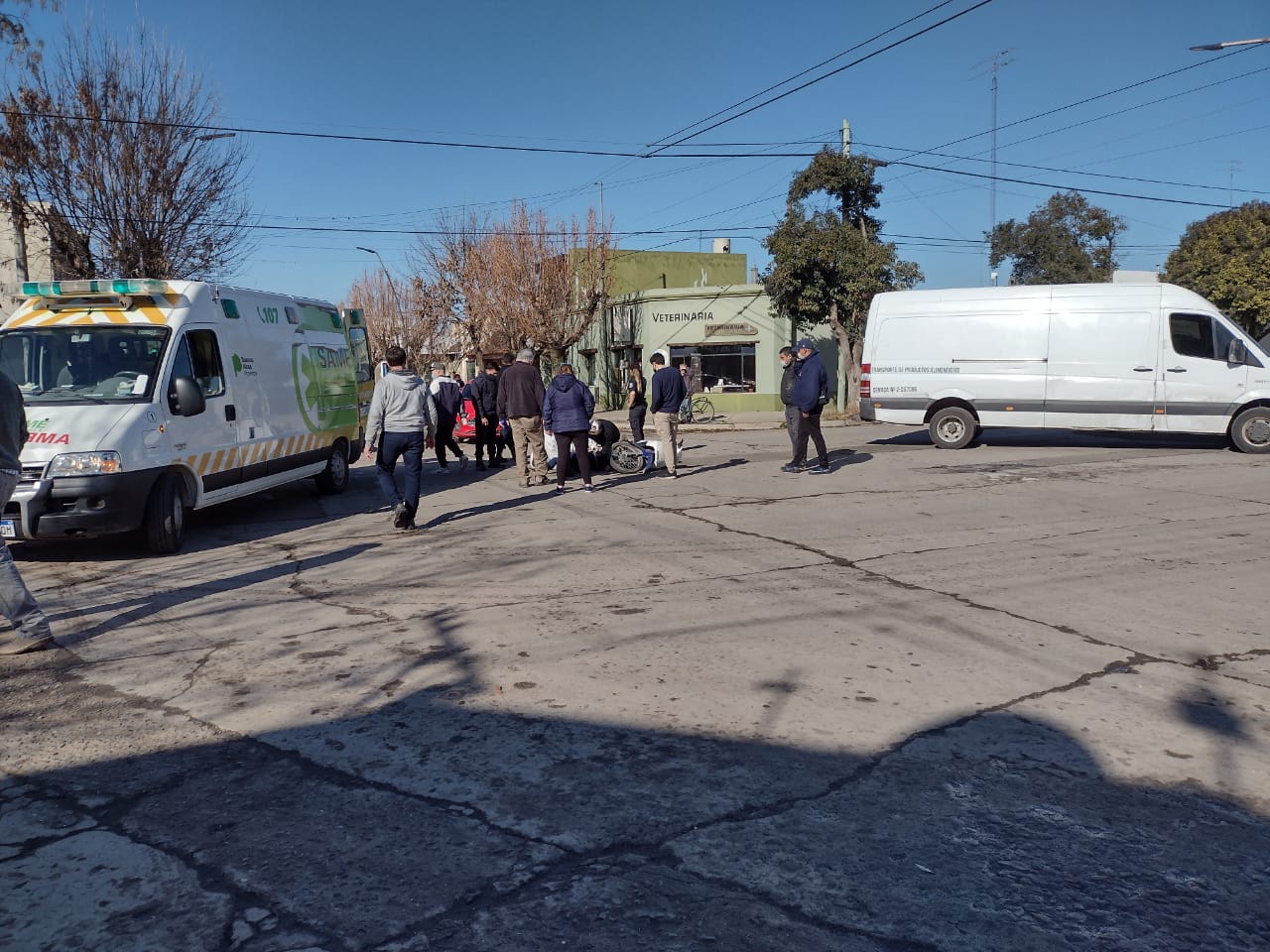 Este mediodía de jueves, una mujer que circulaba en una motocicleta, debió ser trasladada al hospital Municipal donde se le practicaban los estudios de rigor, al haber colisionado la moto en la que circulaba y una combi, en la esquina de Avenida Miguens e Yrigoyen.