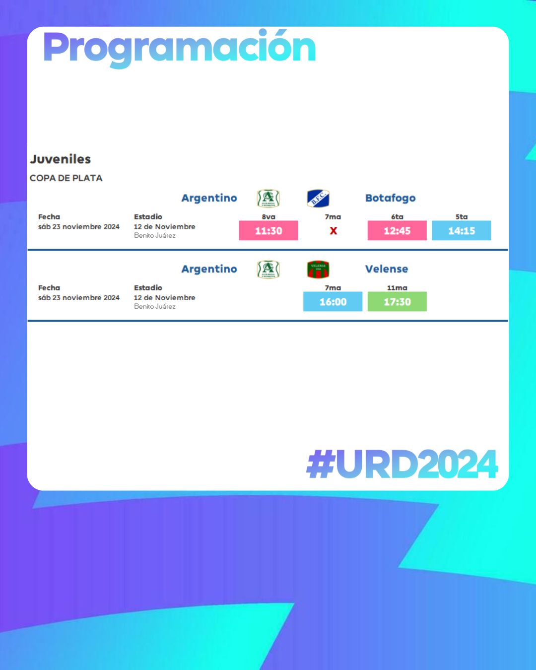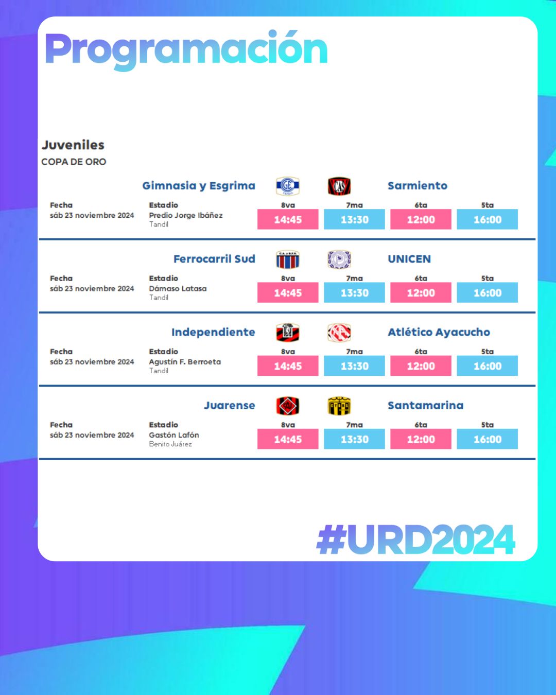 URD – Este sábado se definirá la Copa de Oro en las categorías 8va, 7ma y 6ta 22 noviembre, 2024 Pablo Tusq Deportes, deportes DIA, destacados 0 JUVENILES Este sábado se definirá la Copa de Oro en las categorías 8va, 7ma. y 6ta. Vale recordar que en 5ta, Independiente se consagró campeón a falta de una fecha. Este es el programa de partidos: X