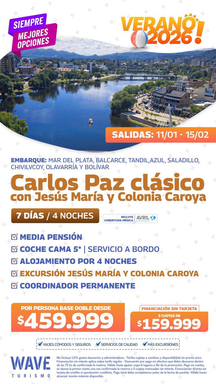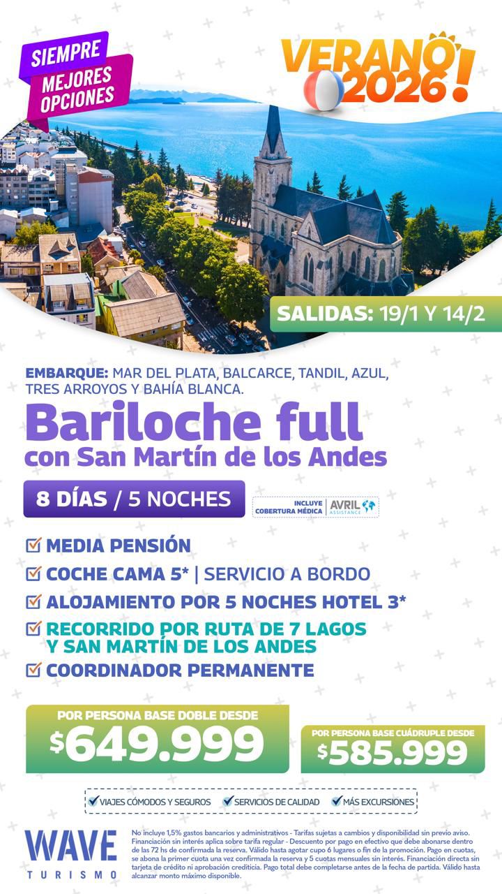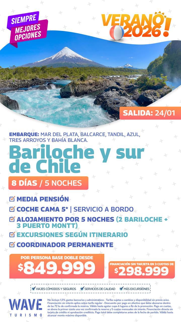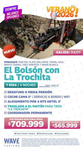 Marita Aranda y WAVE Viajes te ofrecen para este verano, con salida el 4 de enero de 2026, El Bolsón con La Trochita. La propuesta consiste en 7 días/4 noches con Desayuno o Media Pensión, coche cama, con alojamiento en hotel 4 estrellas. Y coordinador permanente. Consulta con Marita al 2494 578431.