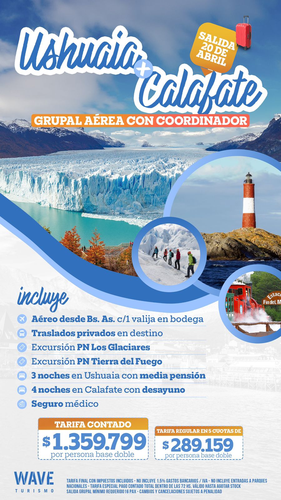Aéreo desde Buenos Aires con valija en bodega. Traslados en destino, excursiones al Parque Nacional Los Glaciares, Tierra del Fuego y más. Incluye 3 noches con Media Pensión. Saluda 20 de Abril.