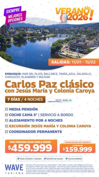 Coche cama embarcando en Mar del Plata, Balcarce, Tandil, Azul y más. Son 8 días/5 noches. Media pensión. Saludas 19 de enero y 14 de Febrero.