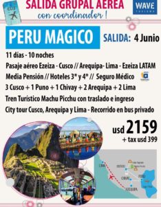El viaje consiste en 11 días – 10 noches incluyendo pasaje aéreo Ezeiza Cusco/arequica – Lima – Ezeiza a través de LATAM, con media pensión, hoteles 3 y 4 estrellas, seguro médico, tren turístico al Machu Pichu, city tour y demás.
