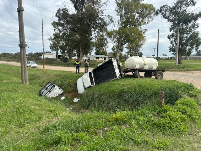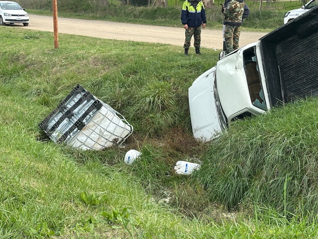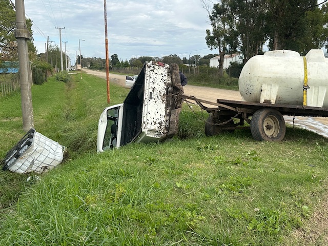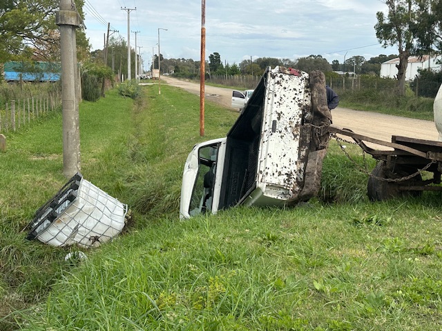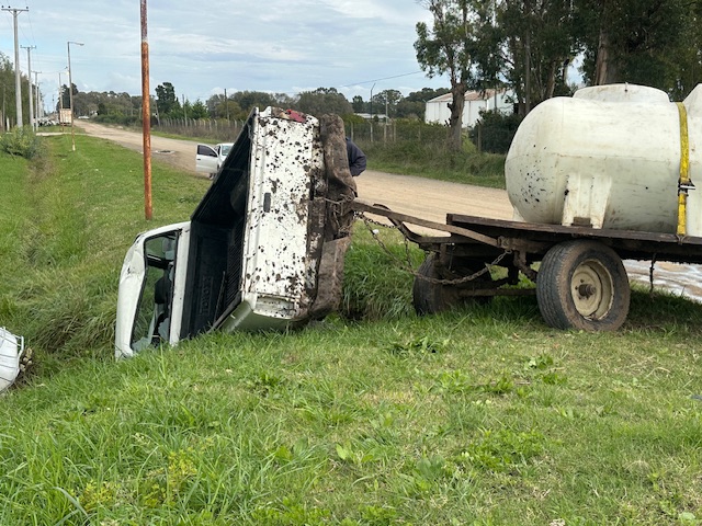 Una camioneta que remolcaba un carro cisterna se despistas y terminó volcando en la zanja de Ruta 50 y calle Los Horneros. El conductor de la camioneta fue trasladado al Hospital Muncipal con golpes varios. Se desconocen los motivos que originaron el accidente.