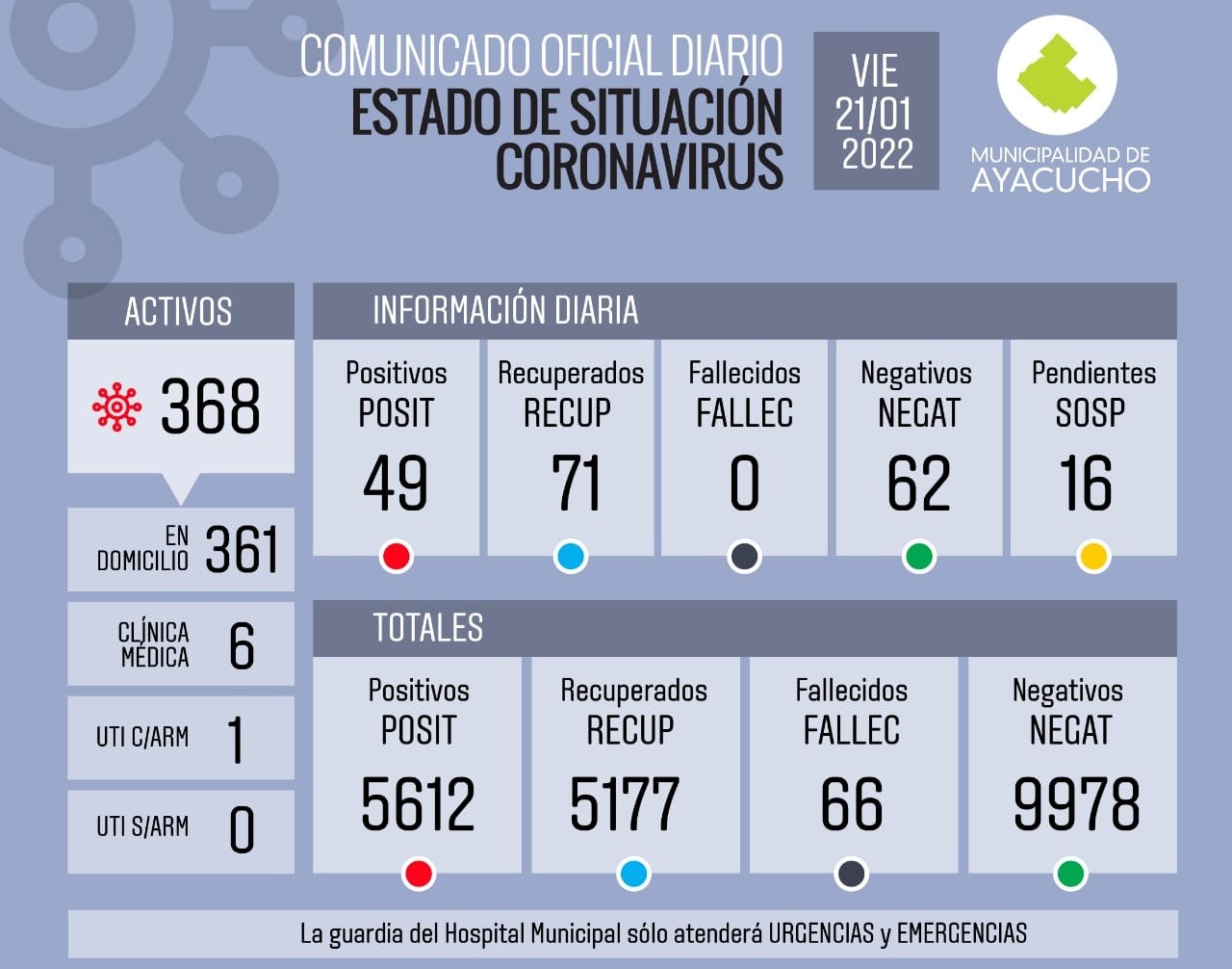 Volvieron a bajar los casos activos de Covid en las últimas 24 horas. De acuerdo al informe, se dieron 49 nuevos positivos en tanto que hubo 71 recuperados. Con estas cifras, los activos son 368 de los cuales 361 se encuentran cursando la enfermedad en sus domicilios, y el resto permanece internado en el Hospital Municipal (6 en clínica médica y 1 en Unidad de Cuidados Intensivos con asistencia respiratoria mecánica).