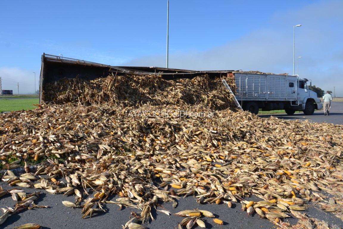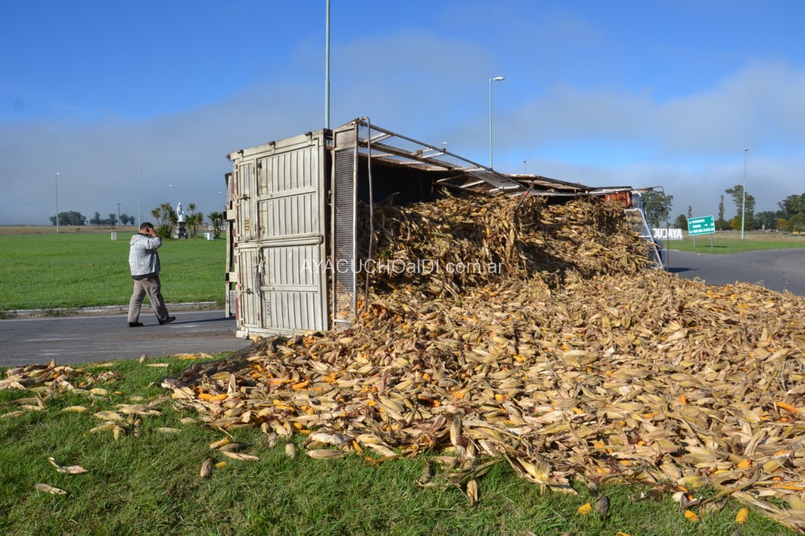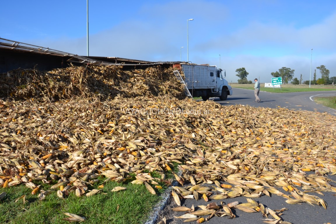 El acoplado de un camión procedente de Venado Tuerto, Santa Fe, volcó este miércoles por la mañana en la rotonda de 29 y 50, dejando toda su carga de choclos sobre la cinta asfáltica. El chofer resultó ileso felizmente dado que el vuelco se produjo a muy baja velocidad, mientras el transporte recorría el centro de la rotonda.