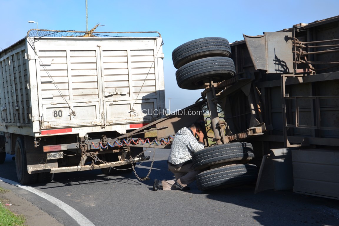Por lo que pudimos averiguar desde nuestro portal, el volumen de la carga hizo que el acoplado del camión procedente de Venado Tuerto se inclinara y terminara volcando sobre su lateral derecho, y dejando toda su carga sobre el asfalto.