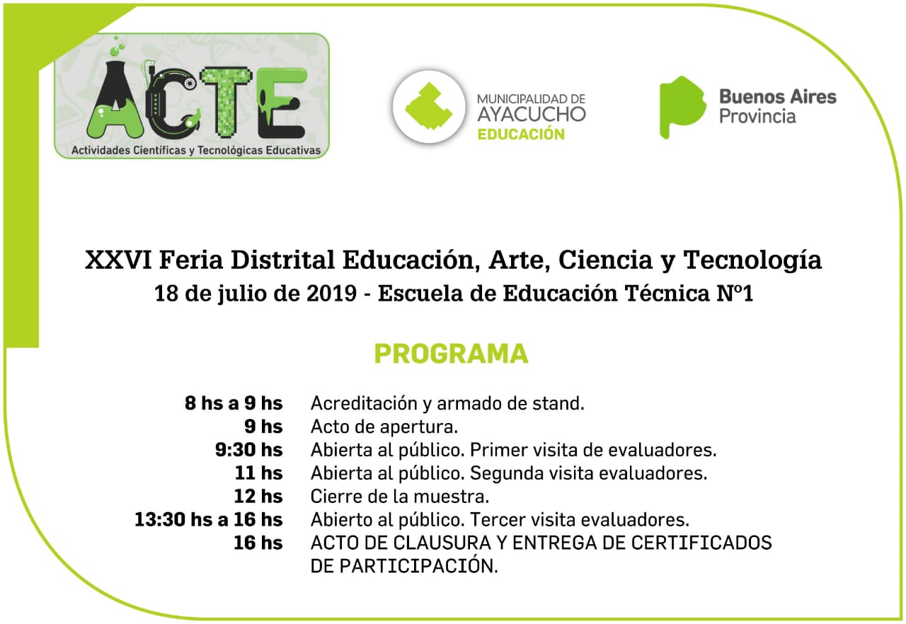 La Escuela de Educación Técnica Nro 1 «Juan Labat Ayacucho», invita por este medio a toda la comunidad a la XXVI Feria Distrital de Educación, Arte, Ciencia y Tecnología, que tendrá lugar este Jueves 18 de Julio en sus instalaciones. Este es el programa oficial:
